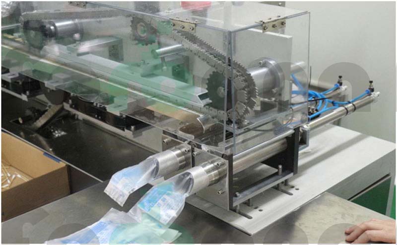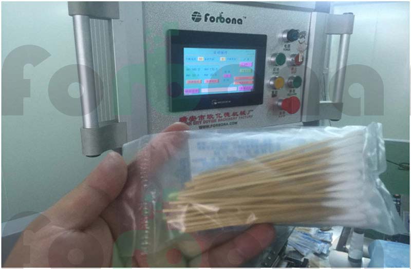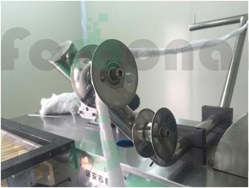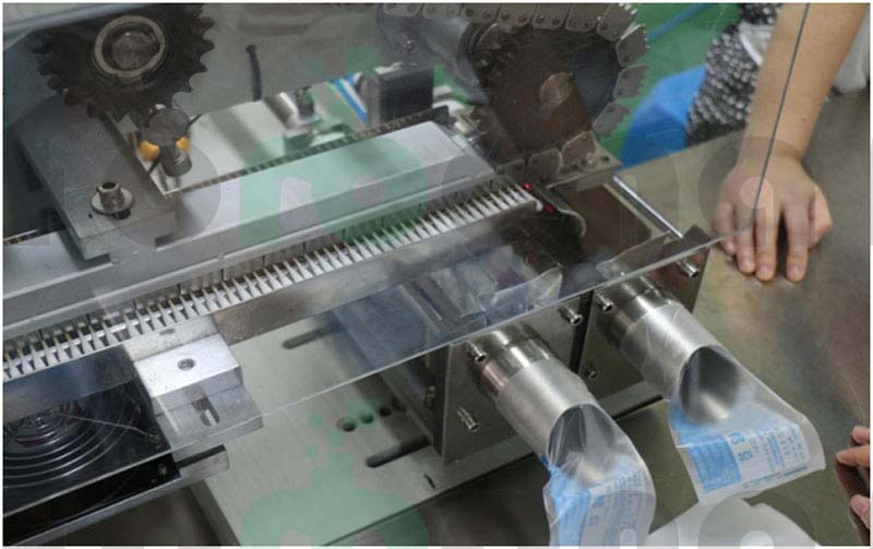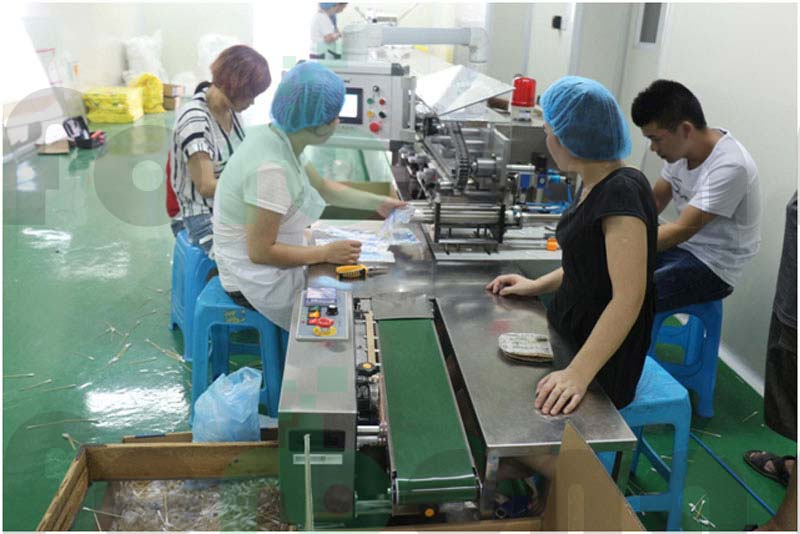 包装台:光电计数器采用日本欧姆龙品牌,更精准的计数保证。只需一个工人完成套袋,机器自动将棉签推入袋中。